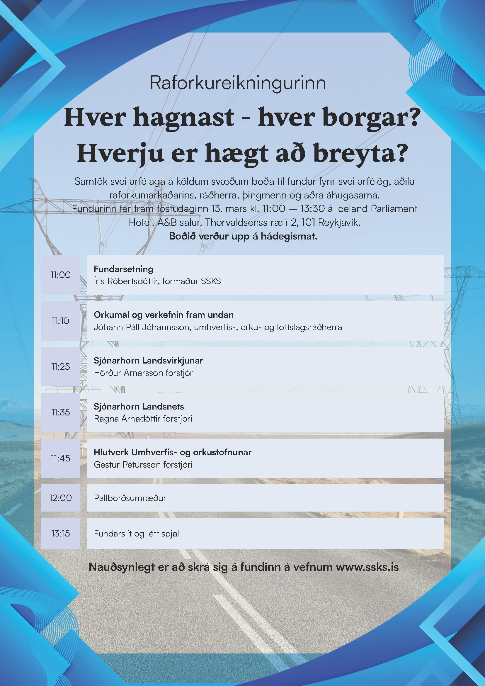 Fundurinn er fyrir aðildarsveitarfélög, aðila raforkumarkaðarins, ráðherra, þingmenn og aðra áhugasama undir yfirskriftinni: Raforkureikningurinn: Hver hagnast – hver borgar? Hverju er hægt að breyta?