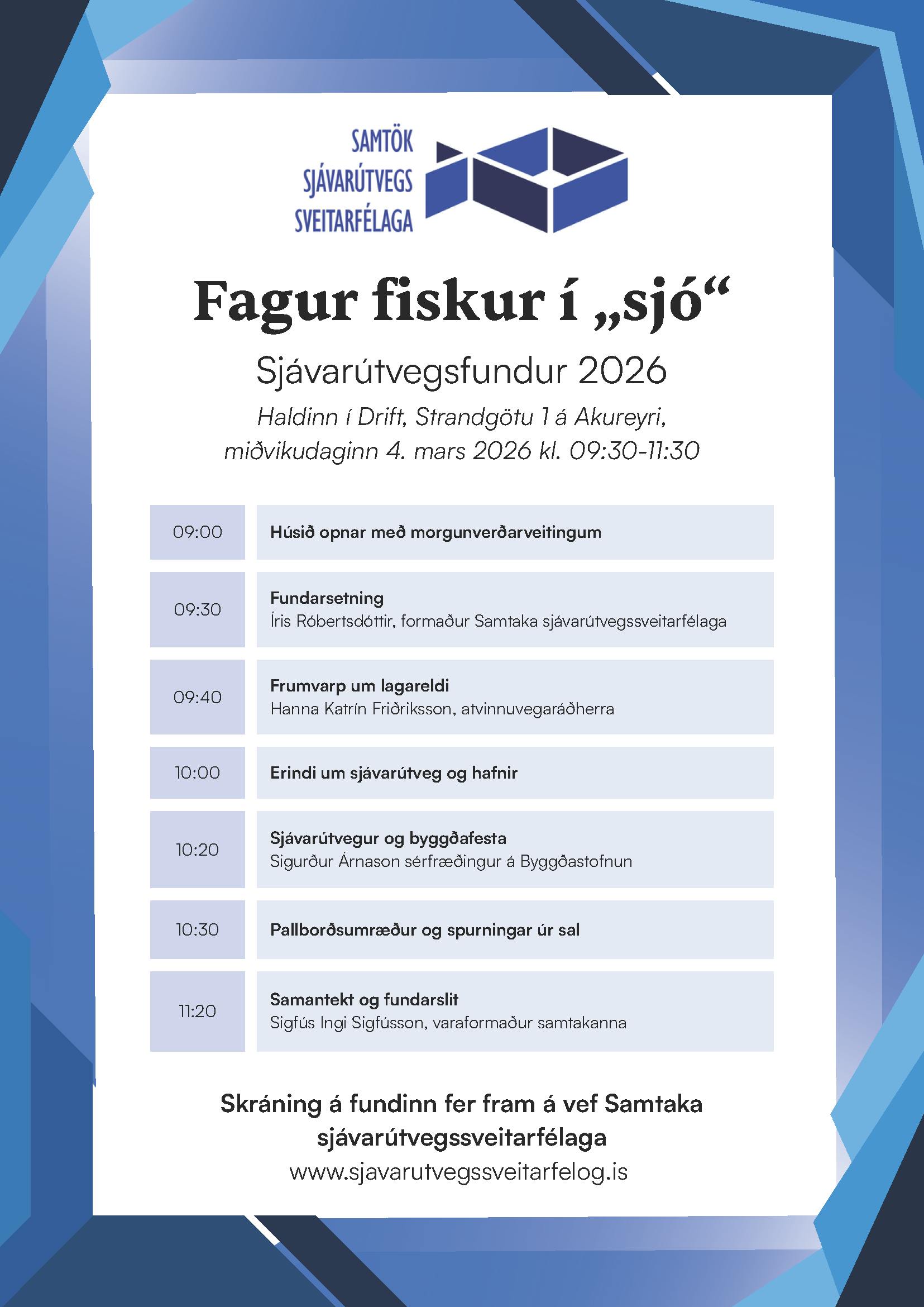 Samtök sjávarútvegssveitarfélaga boða til Sjávarútvegsfundar fyrir aðildarsveitarfélög, ráðherra, þingmenn, aðila innan sjávarútvegs og aðra áhugasama undir yfirskriftinni: Fagur fagur fiskur í „sjó.“ Breytt umhverfi í sjávarútvegi og áhrif á sjávarbyggðir Fundurinn fer fram miðvikudaginn 4. mars kl. 9:30-11:30 og fer fram á Drift, Strandgötu 1, Akureyri Formlegt boð með nánari upplýsingum, dagskrá og staðsetningu verður sent þegar það liggur fyrir.